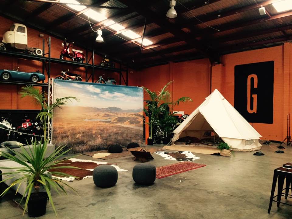 Bell tent pitched indoors, on concrete or other hard surfaces.
