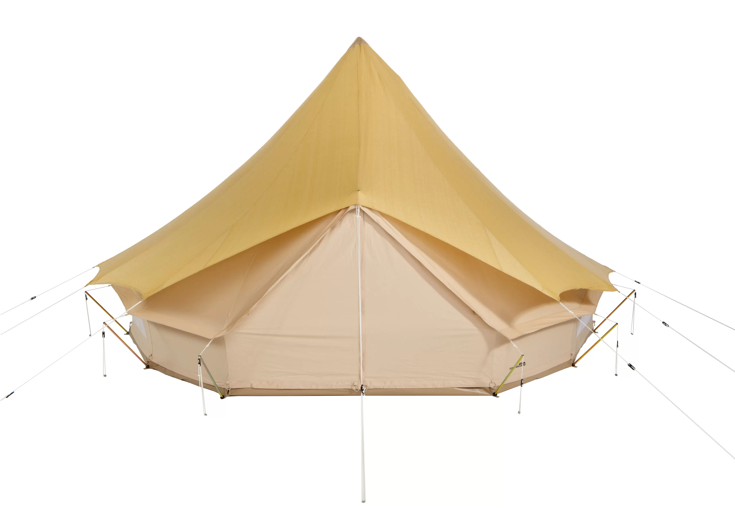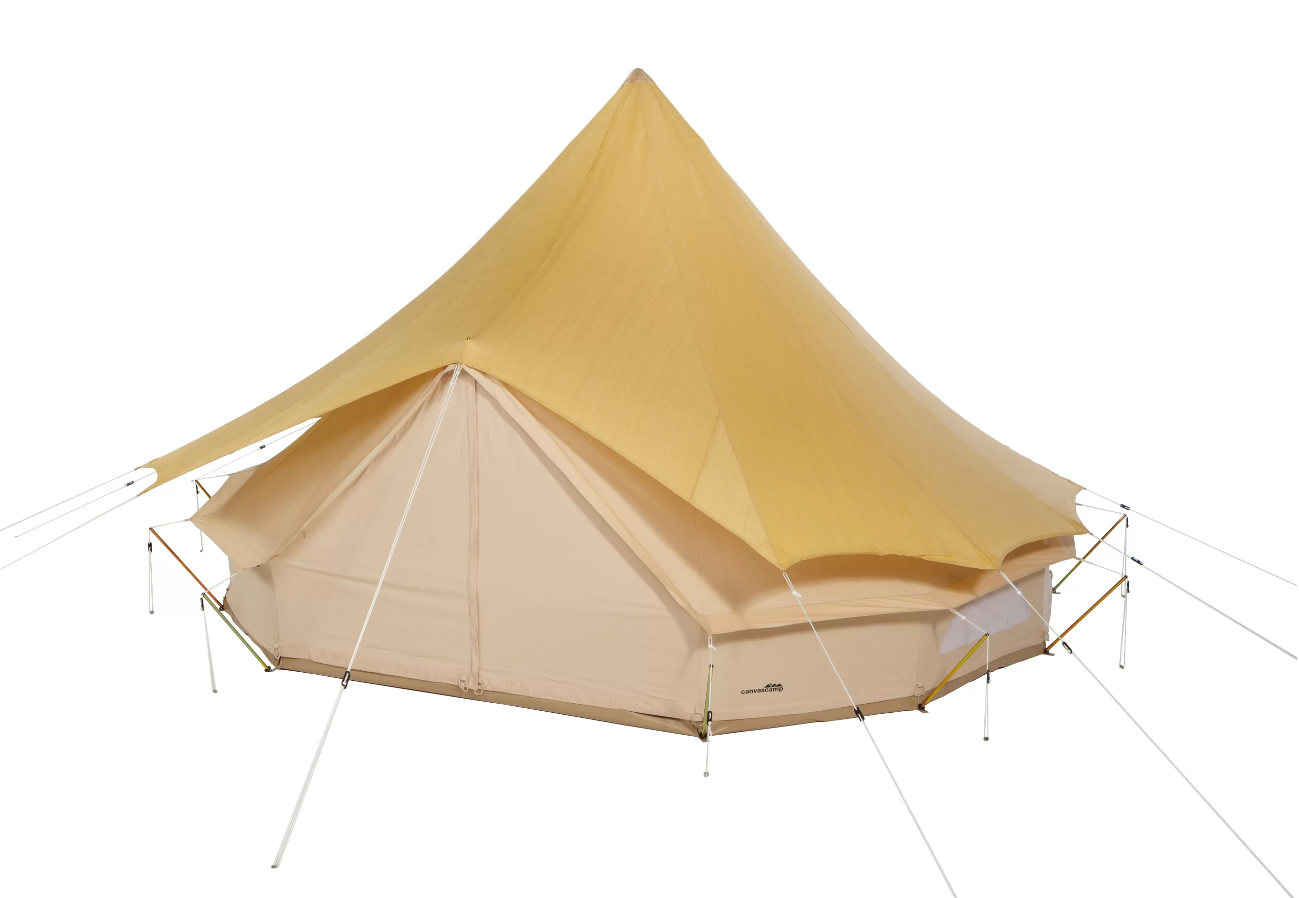 The Double Roof can be set up before and after the bell tent is set up. Secured with professional guy ropes and attached to the top of the A-frame.