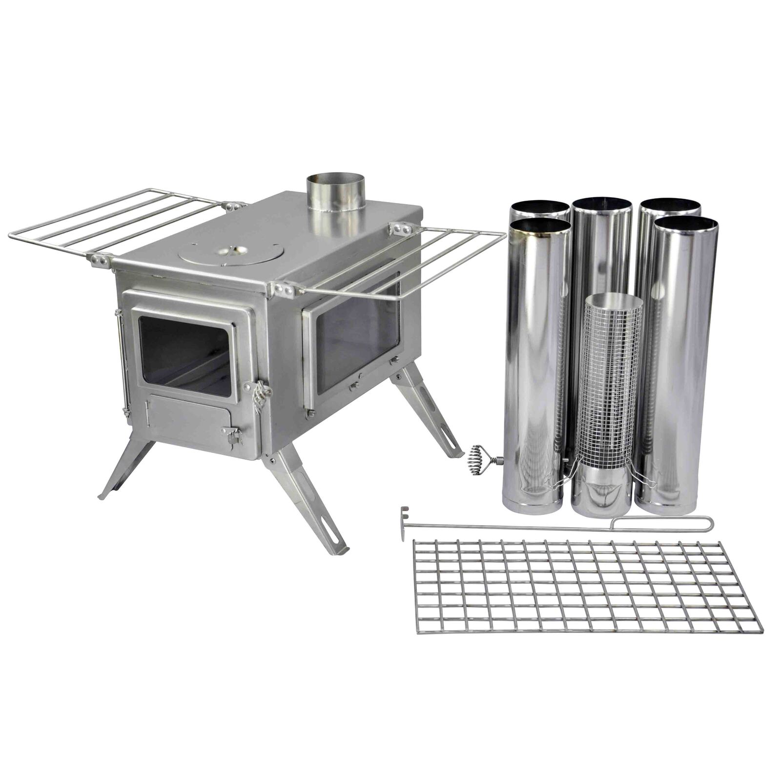 > Includes 1 stove body, 4 sections of straight chimney pipe (3.5” diameter, 16.9” length), 1 airflow controller, 1 spark arrestor, 1 ash scraper and 1 grate